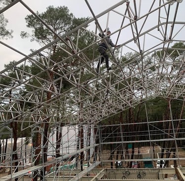 The new building construction in Giruliai utilized the advanced Layher scaffolding system for its flexibility, safety, and efficiency. To protect the structure from weather, special sheeting covered the scaffolding, allowing work to continue uninterrupted by rain or snow. This ensured that construction proceeded on schedule, with all areas of the building easily accessible throughout the project.