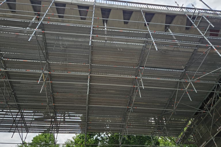 Šis techninis sprendimas suteikė galimybę atlikti konstrukcijų remonto ir atnaujinimo darbus iš apačios, visiškai nesutrikdant eismo ant tilto. Modulinė pastolių sistema leido prisitaikyti prie sudėtingos konstrukcijos geometrijos, užtikrino stabilumą, darbuotojų saugą bei efektyvų darbų organizavimą.